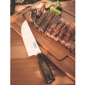 Informações gerais: A bainha em couro que oferece uma proteção ao fio da faca, permitindo o transporte e armazenagem com maior segurança; O cabo de madeira tratada Polywood é resistente à impactos e alta temperaturas garantindo maior resistência e durabilidade; A lâmina de aço inox têm maior durabilidade do fio devido ao tratamento térmico; Pode ir à máquina de lavar louças facilitando seu dia a dia.
