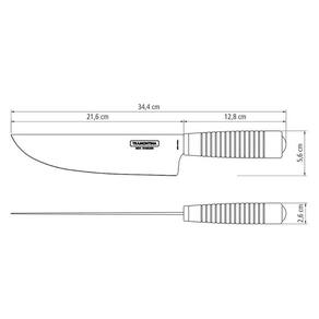 Garantia: 90 dias / Peso: 265g / Cor predominante: inox / Referência: 7891112128323; Dimensões: 34,4cm (C) x 5,6cm (L) x 2,6cm (A); Polegadas: 8 Conteúdo: 1 faca para churrasco; Materiais: aço inox, madeira tratada e couro.