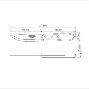 A Faca para Churrasco Jumbo Tramontina com Lâmina em Aço Inox e Cabo de Madeira Polywood Castanho 5 polegadas leva mais resistência e durabilidade na hora de saborear aquele churrasco especial. Produzida com lâmina em aço inox e um estiloso cabo em madeira tratada Polywood, ela vem na cor castanho e é perfeita para tornar sua mesa ainda mais bonita. Além disso, possui um corte perfeito e conta com resistência ao tempo e à umidade. Além disso, é possível lavar a peça na máquina de lavar louças. É uma peça que não pode faltar na sua cozinha. Orientações A lâmina de aço inox têm maior durabilidade do fio devido ao tratamento térmico. O cabo de madeira tratada Polywood é resistentes à impactos e alta temperaturas garantindo maior resistência e durabilidade. Rebite de alumínio. Pode ir à máquina de lavar louças facilitando seu dia a dia. Observações Tenha cuidado ao manusear produtos cortantes e perfurantes e mantenha-os fora do alcance das crianças. Para maior durabilidade dos produtos recomenda-se secar bem antes de guardar, mesmo após lavagem em máquina. Para descarte dos produtos e embalagens siga as orientações de reciclagem vigentes. Características Gerais EAN13 7891112174603 DUN14 17891112174600 NCM 8211.91.00 Peso Líquido 0,1100 kg. Peso Bruto 0,1100 kg. Metragem 0,000140 m³. Dimensões Embalagem (Compr. X Larg. X Alt.) 250x 31x 18 mm. Dimensões Produto (Compr. X Larg. X Alt.) 251x 32x 18 mm. Cor 1 4E3629 Hexa