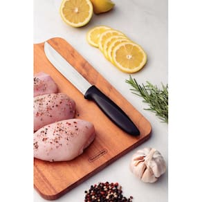 Você vai encontrar funcionalidade e praticidade com a Faca para Cozinha Tramontina Plenus com Lâmina em Aço Inox e Cabo de Polipropileno Preto 6 polegadas da Linha Plenus. É uma faca essencial para diferentes funções na cozinha. Perfeita para o corte de diversos alimentos, ela possui lâmina rígida e estreita de 6 polegadas. Produzida com lâmina em aço inox com um confortável cabo de polipropileno na cor preta, ela leva conforto e estilo para dentro da sua cozinha. Tenha facas Tramontina e deixe sua cozinha incrível! Orientações Com lâmina rígida e estreita, facilita o corte de diversos alimentos.A lâmina de aço inox têm maior durabilidade do fio devido ao tratamento térmico. O cabo de polipropileno possui maior resistência e durabilidade. Pode ir à máquina de lavar louças facilitando seu dia a dia. Observações Antes da primeira utilização, lave bem a peça e seque-a. Produto cortante e perfurante: tenha cuidado ao manusear e mantenha fora do alcance das crianças. Para maior durabilidade do produto recomenda-se secar bem antes de guardar, mesmo após lavagem em máquina. Recomenda-se o uso de tábuas de polipropileno ou madeira da Tramontina para maior durabilidade do fio da faca. Não é indicado o uso da faca para o corte de alimentos congelados. Mantenha sempre sua faca afiada utilizando os afiadores da Tramontina.Para descarte dos produtos e embalagens siga as orientações de reciclagem vigentes. Características Gerais EAN13 7891112225596 DUN14 17891112225593 NCM 8211.92.10 Peso Líquido 0,0680 kg. Peso Bruto 0,0830 kg. Metragem 0,000460 m³. Dimensões Embalagem (Compr. X Larg. X Alt.) 22x 61x 343 mm. Dimensões Produto (Compr. X Larg. X Alt.) 284x 34x 18 mm. Cor 1 000000 Hexa