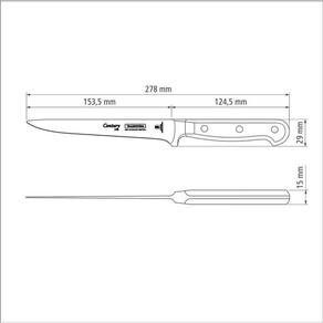 Desossar vai ficar muito mais prático com a Faca para Desossar Tramontina Century com Lâmina em Aço Inox e Cabo em Policarbonato 6 Polegadas. Desenvolvida especialmente para facilitar a separação da carne e ossos, ela apresenta Lâmina em aço inox e Cabo de policarbonato com fibra de vidro, que alia segurança, qualidade e durabilidade para o seu manuseio. As facas da linha Century são desenvolvidas especialmente para uso intenso e podem ser lavadas à máquina de lavar, permitindo mais facilidade para a sua rotina dentro da cozinha. Ideal para separar a carne dos ossos e tirar a gordura. A lâmina forjada de aço inox especial garante um fio com maior durabilidade e precisão. A lâmina possui tratamento térmico diferenciado, composto por têmpera, sub-zero e revenimento. E conta com dureza da lâmina de 55 e 58 HRC, que garante maior resistência do fio e precisão no corte. O cabo de policarbonato reforçado com fibra de vidro garante alta durabilidade, equilíbrio e segurança. O cabo ergonômico proporciona maior segurança, equilíbrio e conforto na hora do corte. Pode ir à máquina de lavar louças facilitando seu dia a dia. Antes da primeira utilização, lave bem a peça e seque-a. Produto cortante e perfurante: tenha cuidado ao manusear e mantenha fora do alcance das crianças. Para maior durabilidade do produto recomenda-se secar bem antes de guardar, mesmo após lavagem em máquina. Recomenda-se o uso de tábuas de polipropileno ou madeira da Tramontina para maior durabilidade do fio da faca. Não é indicado o uso da faca para o corte de alimentos congelados. Mantenha sempre sua faca afiada utilizando os afiadores da Tramontina. Para descarte dos produtos e embalagens siga as orientações de reciclagem vigentes.