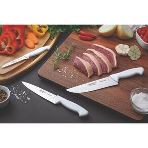Antes da primeira utilização, lave bem a peça e seque-a. Produto cortante e perfurante: tenha cuidado ao manusear e mantenha fora do alcance das crianças. Para maior durabilidade do produto recomenda-se secar bem antes de guardar, mesmo após lavagem em máquina. Recomenda-se o uso de tábuas de polipropileno ou madeira da Tramontina para maior durabilidade do fio da faca. Não é indicado o uso da faca para o corte de alimentos congelados. Mantenha sempre sua faca afiada utilizando os afiadores da Tramontina. Para descarte dos produtos e embalagens siga as orientações de reciclagem vigentes.