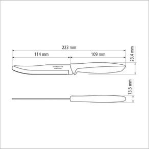 Faca Para Frutas Tramontina Plenus Com Lâmina Em Aço Inox E Cabo De Polipropileno 5" Preto Tramontina Faca para Frutas Tramontina Plenus com Lâmina em Aço Inox e Cabo de Polipropileno 5 Preto Tramontina - Suas frutas vão ficar mais gostosas com a Faca para Frutas Tramontina Plenus com Lâmina em Aço Inox e Cabo de Polipropileno 5 Polegadas da Linha Plenus. Ideal para descascar e cortar frutas, a faca possui fio liso e lâmina de 5 polegadas em aço inox. O cabo em polipropileno na cor preta é resistente e confortável no uso. É uma faca que se adequa a diferentes momentos do seu dia. Fácil de limpar, pode ser levada à máquina de lavar louças.OrientaçõesIdeal para cortar e descascar frutas diversas. A lâmina de aço inox têm maior durabilidade do fio devido ao tratamento térmico. O cabo de polipropileno possui maior resistência e durabilidade. Pode ir à máquina de lavar louças facilitando seu dia a dia.ObservaçõesAntes da primeira utilização, lave bem a peça e seque-a. Produto cortante e perfurante: tenha cuidado ao manusear e mantenha fora do alcance das crianças. Para maior durabilidade do produto recomenda-se secar bem antes de guardar, mesmo após lavagem em máquina. Recomenda-se o uso de tábuas de polipropileno ou madeira da Tramontina para maior durabilidade do fio da faca. Não é indicado o uso da faca para o corte de alimentos congelados. Mantenha sempre sua faca afiada utilizando os afiadores da Tramontina. Para descarte dos produtos e embalagens siga as orientações de reciclagem vigentes.Características GeraisEAN137891112236868DUN1417891112236865NCM8211.92.10Peso Líquido0,0300 kg.Peso Bruto0,0410 kg.Metragem0,000222 m.Dimensões Embalagem (Compr. X Larg. X Alt.)14x 55x 288 mm.Dimensões Produto (Compr. X Larg. X Alt.)223x 23x 14 mm.Cor 1000000 Hexa Características Gerais do Produto: Garantia: - 1 Ano
