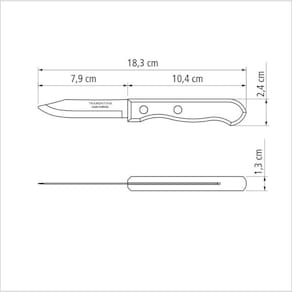 A Faca para Legumes e Frutas Tramontina Dynamic com Lâmina em Aço Inox e Cabo em Madeira Natural 3 Polegadas é a escolha certa para completar sua cozinha. Ideal para cortar, descascar e fazer cortes delicados em legumes e frutas, essa faca de 3 polegadas é perfeita para ter sempre à mão. Produzida com lâmina de aço inox, recebe tratamento térmico que garante maior durabilidade e resistência ao fio de corte. Além disso, possui um diferenciado cabo em madeira natural com rebites de alumínio, garantindo um visual rústico e cheio de estilo para a peça. Orientações Lâmina de aço inox com maior durabilidade do fio devido ao tratamento térmico. Cabo de madeira natural. Rebites de alumínio. Características Gerais EAN13 7891112016651 DUN14 17891112016658 NCM 8211.92.10 Peso Líquido 0,0370 kg. Peso Bruto 0,0500 kg. Metragem 0,000231 m³. Dimensões Embalagem (Compr. X Larg. X Alt.) 14x 60x 275 mm. Dimensões Produto (Compr. X Larg. X Alt.) 183x 24x 13 mm. Observações Antes da primeira utilização, lave bem a peça e seque-a. Produto cortante e perfurante: tenha cuidado ao manusear e mantenha fora do alcance das crianças. Para maior durabilidade do produto recomenda-se secar bem antes de guardar, mesmo após lavagem em máquina. Recomenda-se o uso de tábuas de polipropileno ou madeira da Tramontina para maior durabilidade do fio da faca. Não é indicado o uso da faca para o corte de alimentos congelados. Mantenha sempre sua faca afiada utilizando os afiadores da Tramontina.Para descarte dos produtos e embalagens siga as orientações de reciclagem vigentes.