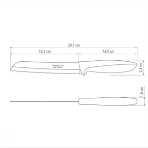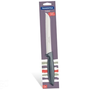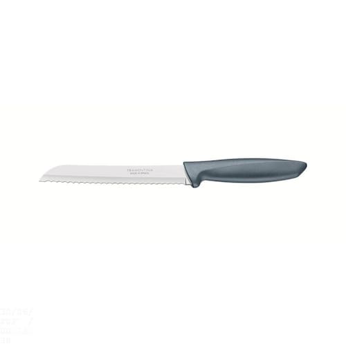 Seja com um pão quentinho da padaria ou um saindo direto do forno da sua cozinha, a Faca para Pão Tramontina Plenus com Lâmina em Aço Inox e Cabo de Polipropileno Cinza 7 polegadas da Linha Plenus está sempre por perto para te auxiliar. Desenvolvida para cortar diferentes tipos de pães sem amassá-los, ela traz mais praticidade e conforto para o dia a dia. É produzida com lâmina de 7 polegadas em aço inox e possui cabo em polipropileno na cor cinza. Leve cuidado e bem-estar para dentro da sua cozinha com as facas Tramontina. Orientações A lâmina serrilhada corta sem amassar.A lâmina de aço inox têm maior durabilidade do fio devido ao tratamento térmico. O cabo de polipropileno possui maior resistência e durabilidade. Pode ir à máquina de lavar louças facilitando seu dia a dia. Características Gerais EAN13 7891112225091 DUN14 17891112225098 NCM 8211.92.10 Peso Líquido 0,0700 kg. Peso Bruto 0,0800 kg. Metragem 0,000400 m³. Dimensões Embalagem (Compr. X Larg. X Alt.) 18x 65x 342 mm. Dimensões Produto (Compr. X Larg. X Alt.) 291x 34x 18 mm. Cor 1 53565A Hexa Observações Antes da primeira utilização, lave bem a peça e seque-a. Produto cortante e perfurante: tenha cuidado ao manusear e mantenha fora do alcance das crianças. Para maior durabilidade do produto recomenda-se secar bem antes de guardar, mesmo após lavagem em máquina. Recomenda-se o uso de tábuas de polipropileno ou madeira da Tramontina para maior durabilidade do fio da faca. Não é indicado o uso da faca para o corte de alimentos congelados. Para descarte dos produtos e embalagens siga as orientações de reciclagem vigentes.