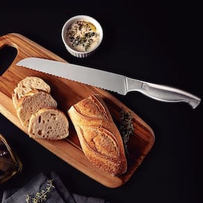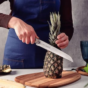 DESCRIÇÃO DA FACA DE PÃO TRAMONTINA 8" - Nada como começar o dia com aquele pão quentinho com manteiga, não é mesmo?! - E para cortá-lo, sem amassar e sem danificá-lo, a faca para pão Tramontina Sublime em aço inox 8 polegadas é indispensável. - Produzida totalmente em aço inox com lâmina serrilhada, ela é uma faca diferenciada, com um design moderno e de linhas exclusivas, que deixa sua cozinha muito mais bonita e garante maior praticidade para seu dia a dia!