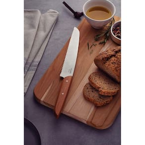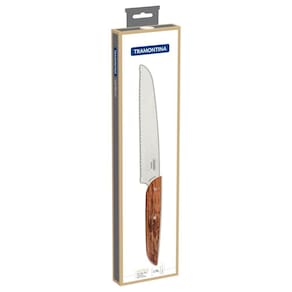 Faca para Pão Tramontina Verttice com Lâmina em Aço Inox e Cabo de Madeira Natural 8" Seu café da manhã fica ainda melhor com aquele pão de forma delicioso, não é mesmo?! E para prepará-lo da melhor maneira, utilize a Faca para Pão Tramontina Verttice com Lâmina em Aço Inox e Cabo de Madeira Natural 8 polegadas. Perfeita para fatiar diversos tipos de pães sem amassá-los, ela é produzida com lâmina em aço inox e cabo de madeira natural com rebites de aço inox que proporciona um visual rústico à peça e maior durabilidade. A faca perfeita para auxiliar você a começar o dia do melhor jeito! A lâmina serrilhada corta sem amassar.A lâmina de aço inox possui maior durabilidade do fio devido ao tratamento térmico.Cabo de madeira natural com rebites de aço inox. Instruções de Primeiro Uso Antes da primeira utilização, lave bem a peça e seque-a.Produto cortante e perfurante: tenha cuidado ao manusear e mantenha fora do alcance das crianças.Para maior durabilidade do produto recomenda-se lavar manualmente e secá-lo antes de guardar.Recomenda-se o uso de tábuas de polipropileno ou madeira da Tramontina para maior durabilidade do fio da faca. Não é indicado o uso da faca para o corte de alimentos congelados. Para descarte do produto e embalagem siga as orientações de reciclagem vigentes. Garantia 90 dias para vícios ou defeitos de fabricação.