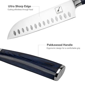 Faca Santoku - Faca Santoku Profissional: Esta faca Santoku Super Sharp da imarku é feita de aço inoxidável HC alemão que resiste à ferrugem, corrosão e descoloração. Pode ser utilizado para suas tarefas diárias de cozinha de cortar, fatiar, cortar e picar todos os tipos de carne, legumes, frutas e pão. É adequado para cozinhas domésticas e de restaurantes - Borda ultra-afiada: esta faca de cozinha é muito afiada e passou por muitos testes rigorosos. É perfeito para cozinhas domésticas e profissionais. A espessura desta faca de cozinha é de 2,5 mm. Sua borda polida à mão é de 15 a 18 graus por lado, o que é resistente e afiado para fazer o trabalho perfeitamente - Design ergonômico: o cabo desta faca Santoku é azul e ergonomicamente projetado. O cabo Parkwood facilita o corte com esta faca. A alça ergonômica reduz a pressão na aderência, para que você não sinta seu pulso cansado mesmo após longas horas de uso. Esta faca Santoku é perfeita para donas de casa, entusiastas da culinária e chefs profissionais - Design exclusivo da lâmina: esta faca de chef Santoku de 18 cm é projetada com uma borda oval oca exclusiva em ambos os lados da lâmina. Este design exclusivo evita que legumes e carne grudem na lâmina ao usar esta faca para cortar legumes ou carne. Esta faca de chef Santoku lhe dará uma ótima experiência ao fatiar, cortar e picar - Garantia e presentes requintados: temos um sistema de serviço pós-venda perfeito para fornecer um serviço satisfatório. Esta faca vem em um pacote muito bom, perfeita para presente de aniversário, presente de Natal, presente de Ação de Graças, etc