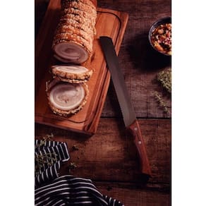 Ideal para cortar seu Brisket assado com precisão e perfeição para sua família e amigos, conte com a faca serrilhada Tramontina Churrasco com lâmina em aço inox escurecido e cabo de madeira 10 polegadas. Com excelente poder de corte e alta resistência, ela possui lâmina de aço inox escurecido e cabo de madeira fixado por rebites, o que a torna uma faca de robusta e de alta qualidade. Escolha Tramontina e garanta uma experiência incrível na hora de fazer seu churrasco!