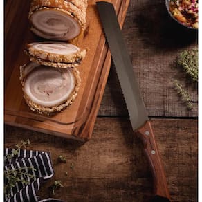 Esta faca Tramontina Churrasco possui os dentes serrilhados, projetados para cortar eficientemente através de carnes grelhadas, proporcionando cortes mais suaves e uniformes, ideal para cortar seu Brisket assado com precisão e perfeição para sua família e amigos. O aço inoxidável escurecido reflete um visual mais robusto e estilizado em uma combinação de funcionalidade, durabilidade e estilo.