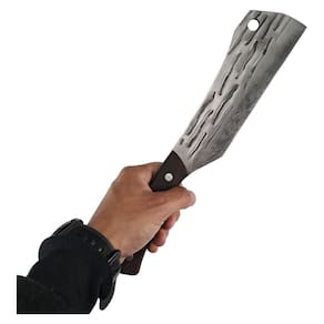 A faca possui um cabo de madeira e uma lâmina de aço inoxidável com marcas decorativas. Essa faca é versátil e adequada para uma variedade de tarefas na cozinha. Com seu cabo confortável e lâmina afiada, ela proporciona um manuseio preciso e seguro.