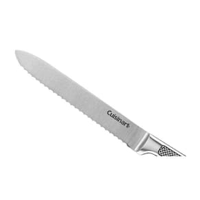 Marca: Cuisinart Modelo: C77SS-5SUT Cor: Prata Tipo: Faca utilitaria serrilhada Dimensoes: 6.99 X 2.24 X 35.56 cm Comprimento da lamina: 13 cm Material da lamina: Aco inox de alto carbono Tipo de fio: Serrilhado Material do cabo: Aco inox texturizado Indicacao de uso: Tomates, frutas, legumes, paes pequenos e alimentos com casca firme Acessorios: Capa protetora para lamina Garantia: 3 meses