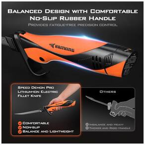 Desfrute de filé de peixe sem fadiga com o Speed Demon Pro da KastKing. Este facão elétrico possui design ergonomicamente equilibrado com cabo TPR macio e fino, garantindo aderência firme e controle preciso. Equipado com motor de alto torque e alta velocidade para filé rápido e suave. Bateria de íon de lítio de 12,6V oferece até 1 hora e 40 minutos de uso contínuo. Inclui lâminas de aço inoxidável 420 resistentes à corrosão, estojo de transporte personalizado e indicador de nível da bateria.