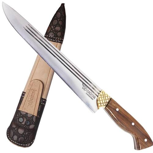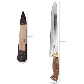 Material: - Couro; - Madeira; - Aço carbono 1070: Aço de maior resistência e dureza que mantem um excelente fio por mais tempo. Com a utilização, a lâmina cria uma pátina natural azulada ou acinzentada apreciada no universo da cutelaria. Trata-se de uma fina oxidação na superfície da lâmina com desenho determinado pelo manuseio da faca, isto confere personalidade à peça. Essa oxidação cria uma película extremamente dura que ajuda a proteger o aço.