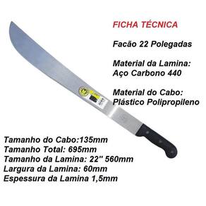 material da lamina: aço carbono 440 material do cabo: plástico pvc tamanho do cabo:13,5cm tamanho total: 69,5 cm tamanho da lamina: 22 polegadas 56 cm largura da lamina: 6cm espessura da lamina 1,5mm marca: duas caras bellota