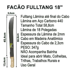 a lâmina do facão é de inox carbono 440 afiado, de modo a facilitar o corte dentro do matagal, alcançando uma longa distância. Tem alta durabilidade em sua lâmina, além de um cabo de plástico com boa resistência. É um produto fácil de ser manuseado garantido um corte preciso e fino. Fabricado em aço com alto teor de carbono, o facão para mato proporcionando resistência mecânica, lamina fulltang inteira até o final do cabo e com um cabo de madeira que garante resistência e segurança.