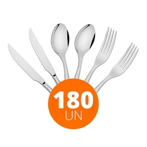 COMPONENTES DO KIT: 60 Faca para Churrasco Laguna em Aço Inox - Tramontina 63906180 60 Garfo de Mesa Laguna em Aço Inox - Tramontina 63906020 60 Colher de Sopa Laguna em Aço Inox - Tramontina 63906010
