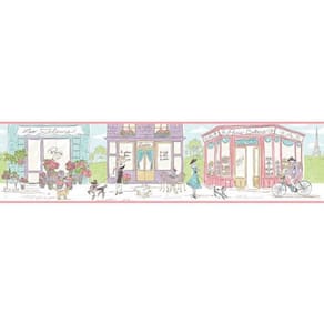 Faixa de Parede Waverly Kids Ooh La La WK6821BD destacando lugares do cotidiano francês, as calçadas com os cafés e bakerys, destacando um charmoso estilo de vida.