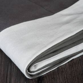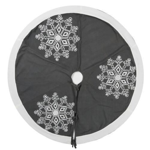 Falda para árbol de Navidad decorativa Vickerman de 60" (152 cm) con copos de nieve invernales. - Tela tipo duckcloth gris frost festiva - Borde blanco puro y motivo bordado de copo de nieve - Forro completo - Cierre con lazo