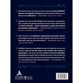 Uma carta de amor, um apelo, um louvor, uma prece. Esse é Bill McKibben em seu magnífico momento. Um alerta sensato, ainda que com tudo em risco. Não perca.” - Naomi Klein, autora de Em chamas Ninguém fez mais que Bill McKibben para aumentar a conscientização a respeito das grandes questões de nosso tempo. Falha Humana é um livro essencial # franco, abrangente e, apesar das chances em contrário, esperançoso.” - Elizabeth Kolbert, autora de A Sexta Extinção e agraciada com um Pulitzer Falha Humana é uma brilhante e apaixonada convocação à batalha para resgatar nosso clima, das mãos daqueles que lucram com sua destruição, antes que seja tarde demais.” - Jane Mayer, autora best-seller de Dark Money McKibben descreve a quantidade imensa de problemas em que nos metemos com um tom tão sereno, com exemplos tão recentes e inesperados… que você, sem notar, envolve-se em uma contemplação lúcida do fim potencial da civilização humana. E mais à frente, em Falha Humana, quando ele descreve o que temos que fazer para evitá-lo, você acredita que ainda vale a pena tentar.” - Alan Weisman, The New York Review of Books