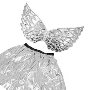 Especificações Técnicas: Modelo: Fantasia de Anjinho Asas e Saia Cor: Prateado Material: Poliéster saia e asas , Poliamida revestimento do cós Tamanho: Único Infantil Largura das Asas: 41 cm Comprimento da Saia: 30 cm