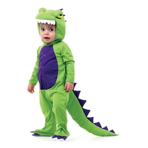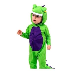 Fantasia Dinossauro BebêPreço por kit de fantasia.Modelo: Dinossauro bebê.Especificações:• Personagem: Dinossauro• Tecido macacão: 100% PoliésterTamanhos (manequim-altura da criança):• P (12 a 18 meses - até 79 cm);A fantasia é composta por:• Macacão longo com rabo e capuz.