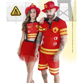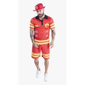Lindo modelo para arrasar no Carnaval, Fantasia de Bombeiro Adulto, rica em detalhes, composta por camiseta vermelha com detalhes em amarelo, com distintivo, gola preta com botões e shorts vermelho com detalhes nas laterais.