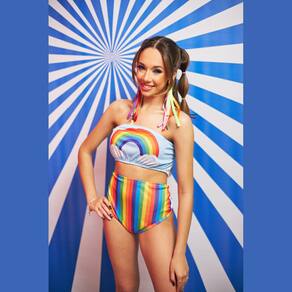 Top Faixa: Com estampa vibrante do arco-íris. Calcinha Cintura Alta: Nas cores do arco-íris, com design moderno e confortável. Diferenciais: Ideal para festas, bloquinhos e eventos temáticos. Não acompanha brincos. Material: 100% poliéster, leve e de alta durabilidade.