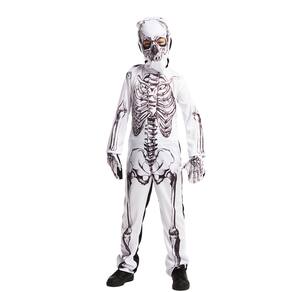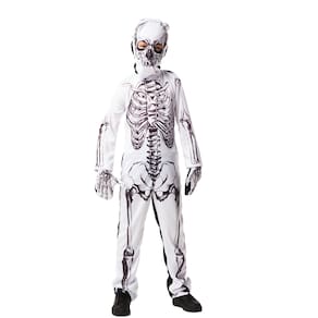 A Fantasia Esqueleto Caveira é composta por um macacão longo na cor branca, criando uma aparência impressionante e assustadora.