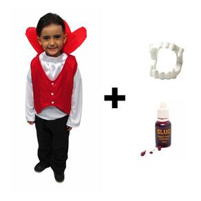 Especificações TécnicasContém: Fantasia (Calça, camisa e colete), dentadura e 1 bisnaga de sangue artificial comestível. NÃO ACOMPANHA DEMAIS ACESSÓRIOS Fantasia Composição de tecido: 100% poliéster