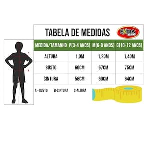 Medida/Tamanho P(3 a 4 anos) M(6 a 8 anos) G(10 12 anos) Altura 1,0m 1,20m 1,40m Busto 60cm 67cm 75cm Cintura 56cm 60cm 64cm