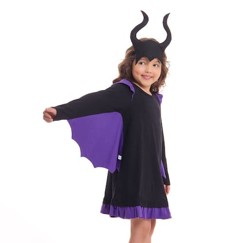 A fantasia infantil de Vilã em algodão se trata de um vestido infantil preto com mangas longas tipo morcego e detalhes em roxo. Confeccionado em material macio e aconchegante, esse vestido pode ser utilizado também como pijama, sendo ideal para a criança usar tanto na hora de brincar como na hora de dormir. Para completar a brincadeira, a peça acompanha uma tiara em feltro. Informações técnicas:Tecido: 100% algodão Marca: FÁBRICA DE SONHOS