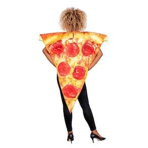 - O TRAJE INCLUI: túnica triangular com estampa de pizza de pepperoni. Tamanho único para a maioria dos adultos.