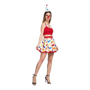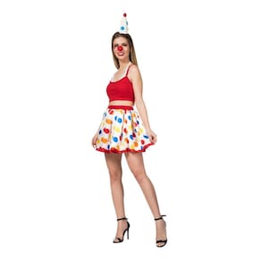 Linda Fantasia de Palhaça Feminina Adulto, composta por regata, saia com bolinhas coloridas e ainda acompanham o chapéu e nariz de Palhaço. Pura alegria e diversão!