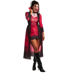 A Fantasia Rainha Vampira apresenta um vestido curto vermelho com uma estampa de morcegos, garantindo um visual sombrio e encantador para a noite de Halloween.