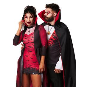 O vestido vem com uma calda longa, adicionando um toque majestoso e misterioso ao seu visual de Rainha Vampira. O vestido possui mangas 3/4 e uma gola alta, conferindo um toque elegante e sedutor ao traje.
