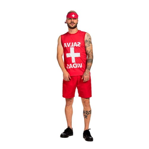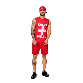 Lindo modelo para arrasar no Carnaval, fantasia de Salva Vidas masculino adulto, composta por tecido super leve, uma regata detalhada estampada e um shorts vermelho.