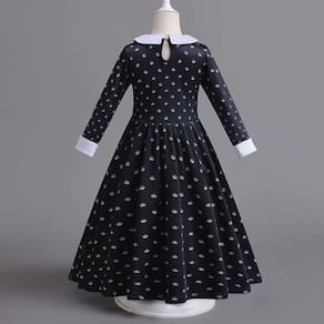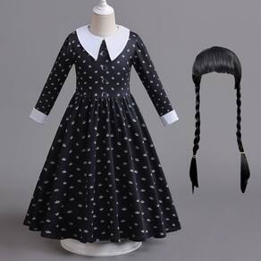 Esta fantasia inclui um vestido encantador e uma peruca estilosa, ambos inspirados na icônica personagem Vandinha Addams. O vestido é confeccionado com material de alta qualidade, proporcionando conforto e durabilidade para que sua pequena possa brincar à vontade. A peruca completa o visual, dando o toque final para uma transformação completa.