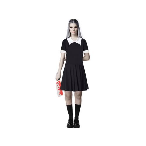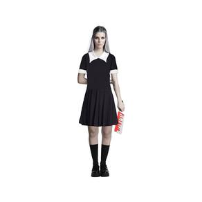 Modelo impecável identica ao da personagem, composta por um vestido preto, gola alta na cor branca e mangas curtas com a barra na cor também brancas, que adicionará um estilo de assinatura ao seu traje, deixando a fantasia mais bonita e completa!