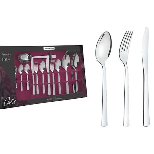 Faqueiro 101 Peças Aço Inox Alto Brilho Oslo Tramontina Faça diferente com o Faqueiro Tramontina em Aço Inox com Facas de Mesa Acabamento Alto Brilho 101 Peças da linha Oslo. Peso Líquido: 4,4800 kg. Peso Bruto: 5,0400 kg. Metragem: 0,013671 m³. Dimensões Embalagem (Compr. X Larg. X Alt.): 525x 310x 84Mm. Conteúdo do jogo 12 Colheres de mesa 1 Colher para salada 1 Colher para arroz 12 Colheres para café 12 Colheres para chá 12 Colheres para sobremesa 1 Concha terrina 12 Facas de mesa 12 Facas para sobremesa 12 Garfos de mesa 1 Garfo para salada 12 Garfos para sobremesa 1 Pá para açúcar
