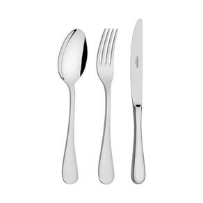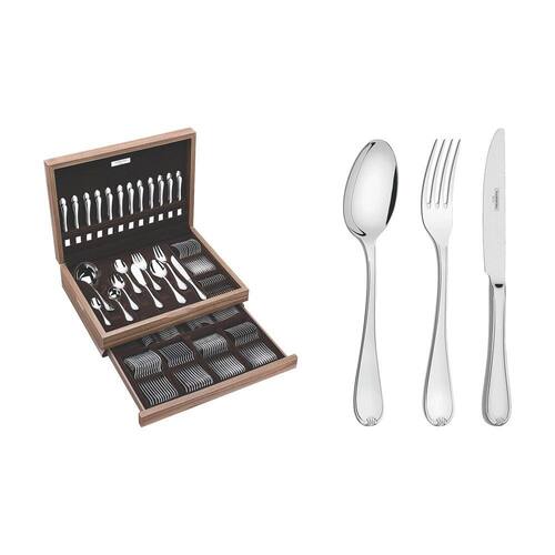 Conteúdo do Jogo: 12 Colheres de Mesa, 1 Colher de Arroz, 12 Colheres para Café, 12 Colheres para Chá, 12 Colheres para Sobremesa, 1 Concha para Molho, 1 Concha Terrina, 12 Facas de Mesa, 12 Facas para Peixe, 12 Facas para Sobremesa, 12 Garfos de Mesa, 12 Garfos para Peixe, 12 Garfos para Sobremesa, 1 Pá para Açúcar, 2 Talheres para Salada, 2 Talheres Trinchante para Carne, 2 Talheres Trinchante para Peixe.