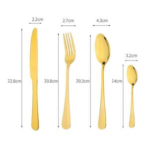 O kit é composto de 6 garfo, 6 faca e 6 colheres de sopa e 6 colheres sobremesa em aço inox dourado, e 1 suporte em aço inox cor (Dourado).