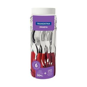 Faquerio 30Pçs Ipanema Vermelho Lâminas de Aço Tramontina Para você manter o charme na sua cozinha, o faqueiro Tramontina Ipanema com lâminas em aço inox e cabos de polipropileno vermelho com pote plástico 30 peças é a escolha perfeita Os talheres têm lâminas produzidas em aço inox que oferecem maior durabilidade devido ao tratamento térmico, e ainda, cabos em polipropileno na estilosa cor vermelha, proporcionando um manuseio super leve e confortável, além de deixar sua mesa muito mais bonita. O pote plástico com design moderno que acompanha o produto é ideal para armazenar alimentos ou guardar os talheres, tornando o faqueiro muito prático de ser armazenado. Além disso, os talheres são muito fáceis de limpar e podem ir à máquina de lavar louças. Praticidade e qualidade é com os talheres Tramontina Informações Gerais Lâminas de aço inox. Lâminas das facas com maior durabilidade do fio devido ao tratamento térmico. Garfos e colheres que garantem maior resistência devido a espessura do aço e a estampagem das lâminas. Cabos de polipropileno com maior resistência e durabilidade. Podem ir à máquina de lavar louças facilitando seu dia a dia. Conteúdo: 6-facas para Churrasco 5 6-garfos de Mesa 6-colheres de Mesa 6-garfos para Sobremesa 6-colheres para Chá Marca: Não Informado Ean: 7897460030707