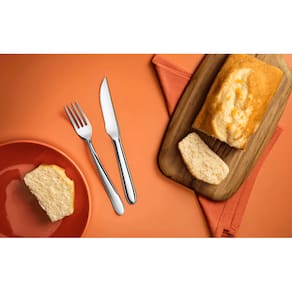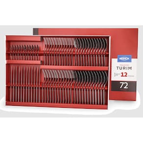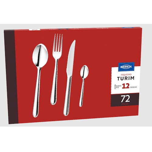 A Linha Turim é uma aliada no dia a dia. Os talheres proporcionam resistência, segurança e garantem uma rotina eficiente. Os talheres são feitos de aço inox com acabamento polido, e os cabos apresentam um friso que é marca da linha. Este faqueiro de 72 peças contém talheres para servir uma refeição para doze pessoas: colheres e garfos de mesa, facas de churrasco, colheres e garfos de sobremesa e colheres de café. Todos os utensílios podem ir à lava-louças. Acabamento vibrado Facas com polimento extra brilho Espessura: 2 mm da faca Espessura: 1,2 mm do garfo e colher
