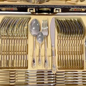 Faqueiro 84 Pçs Banhado Ouro 24k Faqueiro Inox Luxo 84 Peças Dourado com Maleta Peças em Aço Inoxidável 18/10 3.0mm de espessura com filetes dourados, design exclusivo e sofisticado Faqueiro leva charme, elegância e bom gosto para a composição da sua mesa.Um faqueiro clássico produzido em aço inox, ricamente adornado e exclusivo.Todas as peças são produzidas em aço inoxidável.Apresentam espessura de 3mm e acabamento espelhado.Caixa produzida no estilo maleta reforçada com fechamento em sistema de código. 01 Maleta com:12 Colheres12 Garfos principais12 Facas principais12 colheres chá/sobremesa12 Garfos sobremesa01 Espátula pata bolo02 Garfos peixe01 Concha grande01 Concha pequena01 Colher açucareiro01 Pegador02 Colheres para servir02 Colheres de salada Garantia 1 ano.