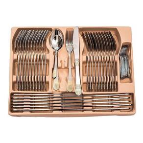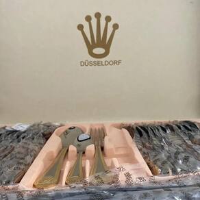 Faqueiro 84 Peças Designer Alemão 24k Faqueiro Aço Cirugico Luxo 84 Peças Dourado com Maleta Peças em Aço cirugico Inoxidável 18/10 3.0mm de espessura com filetes dourados ouro 24k, design exclusivo e sofisticado Faqueiro leva charme, elegância e bom gosto para a composição da sua mesa. Um faqueiro clássico produzido em aço inox, ricamente adornado e exclusivo. Todas as peças são produzidas em aço inoxidável. Apresentam espessura de 3mm e acabamento espelhado. Caixa produzida no estilo maleta reforçada com fechamento em sistema de código. 01 Maleta com:12 Colheres 12 Garfos principais 12 Facas principais 12 colheres chá/sobremesa 12 Garfos sobremesa 01 Espátula pata bolo 02 Garfos peixe 01 Concha grande 01 Concha pequena 01 Colher açucareiro 01 Pegador02 Colheres para servir 02 Colheres de salada.