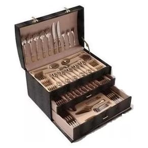 Faqueiro 86 pcs banhado ouro 24k Faqueiro para 12 pessoas em aço inoxidável 18/10 3.0mm de espessura com filetes dourados, design exclusivo e sofisticado Um faqueiro clássico produzido em aço inox ricamente adornado e exclusivo. Todas as peças são produzidas em aço inoxidável. Apresentam espessura de 3mm e acabamento espelhado. Filetes folheados a ouro. Luxuosa caixa em couro croco preto, estilo maleta reforçada com trava por senha.
