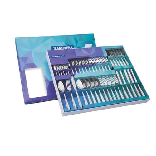 66950774 TRAMONTINA FARROUPILHA Faqueiro 42 peças Cosmos. 1. Peças totalmente feitas de aço inox, altamente duráveis, mantêm suas características originais, preservando a beleza, a higiene e a durabilidade do material. 2. Colheres com bojo em formato simétrico e bordas cuidadosamente arredondadas. 3. Garfos com dentes polidos na parte interna, com formato apropriado para a boca e bordas arredondadas para proporcionar maior conforto no uso. 4. Facas totalmente temperadas, que garantem maior durabilidade no fio de corte e maior resistência à corrosão, e por suas características de temperabilidade, não riscam as porcelanas. 5. Acabamento em brilho. 6. Próprias para uso diário combinam com qualquer ambiente. 7. Podem ser lavadas diariamente na máquina de lavar louças. Talheres de aço inox. EAN13: 7891116088838 DUN14: 17891116088835 NCM: 8215.20.00 Peso Líquido: 1,2200 kg. Peso Bruto: 1,7650 kg. Metragem: 0,012912 m³. Dimensões Produto (Compr. X Larg. X Alt.): 558x 445x 52 mm. .. Cosmos 6 63950017 Colher de mesa 6 63950087 Colher para café 6 63950077 Colher para chá 6 63950047 Colher para sobremesa 6 63950187 Faca para churrasco 6 63950027 Garfo de mesa 6 63950140 Garfo para torta .