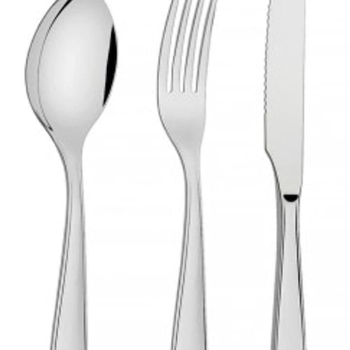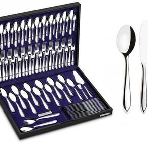 66906/300Talheres de aço inox. Estojo de madeira MDF.Conteúdo12 un Colher de mesa12 un Garfo de mesa12 un Faca de mesa12 un Colher para café01 un Pá para açúcar02 un Talheres para salada12 un Garfo para torta01 un Pá para bolo12 un Colher médiaOrientações GeraisUse apenas sabão ou detergente e uma esponja macia. Outros tipos de produtos, como palha de aço, poderão riscar ou prejudicar o brilho dos talheres. Enxágue bem cada peça a fim de remover totalmente os resíduos dos produtos de limpeza, que, por serem abrasivos, podem atacar o inox. Sempre que possível, use água quente, pois renova o brilho do talher. Após a lavagem, enxugue imediatamente os talheres, caso contrário, as substâncias químicas da água (cloro) poderão causar manchas. Evite atrito entre os talheres durante o processo de lavagem e no armazenamento, para mantê-los sem riscos. Evite o contato das peças com superfícies quentes. Elas provocam a descoloração do produto. Não guarde os talheres em locais úmidos. A umidade também provoca manchas.Qualquer faca, independentemente de marca, para manter o fio de corte, é fabricada em aço com maior teor de carbono e, por isso, é menos resistente à corrosão. Assim, pedimos uma atenção especial para este artigo, pois estará mais propenso aos problemas citados. Usando máquina de lavar louças Não carregue em demasia a cesta dos talheres. Separe bem as peças, pois o contato permanente entre as mesmas, durante a secagem, poderá causar manchas. Retire os talheres logo que tenha terminado o ciclo "enxaguar", a fim de que os mesmos sejam secados manualmente.Benefícios do Produto1. As peças são acondicionadas em um belo estojo de madeira MDF. 2. Totalmente feitas de aço inox, altamente duráveis, mantêm suas características originais, preservando a beleza, a higiene e a durabilidade do material. 3. Colheres com bojo em formato simétrico e bordas cuidadosamente arredondadas. 4. Garfos com dentes polidos na parte interna, com formato apropriado para a boca e bordas arredondadas para proporcionar maior conforto no uso. 5. Facas com lâminas temperadas, que garante maior durabilidade no fio de corte e maior resistência à corrosão, e por sua característica de temperabilidade, não riscam as porcelanas. 6. Acabamento brilho e fosco. 7. Serviço para mesa e sobremesa. 8. Podem ser lavadas diariamente na máquina de lavar louças.