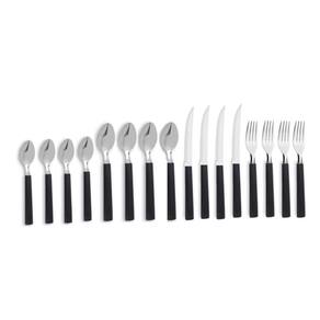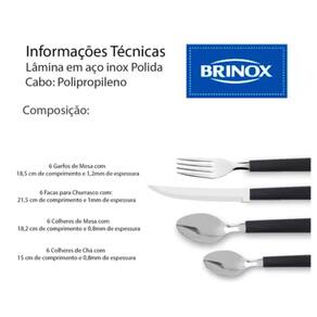 - Composição: lâmina de aço inox, cabo de polipropileno - Dimensões: Garfo de Mesa: 18,5cm Comprimento x 1,2mm Espessura Faca de Churrasco: 21,5cm Comprimento x 1mm Espessura Colher de Mesa: 18,2cm Comprimento x 0,8mm Espessura Colher de Chá: 15cm Comprimento x 0,8mm Espessura